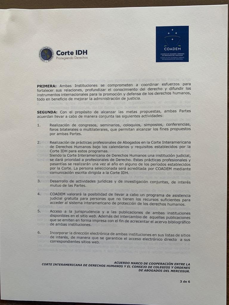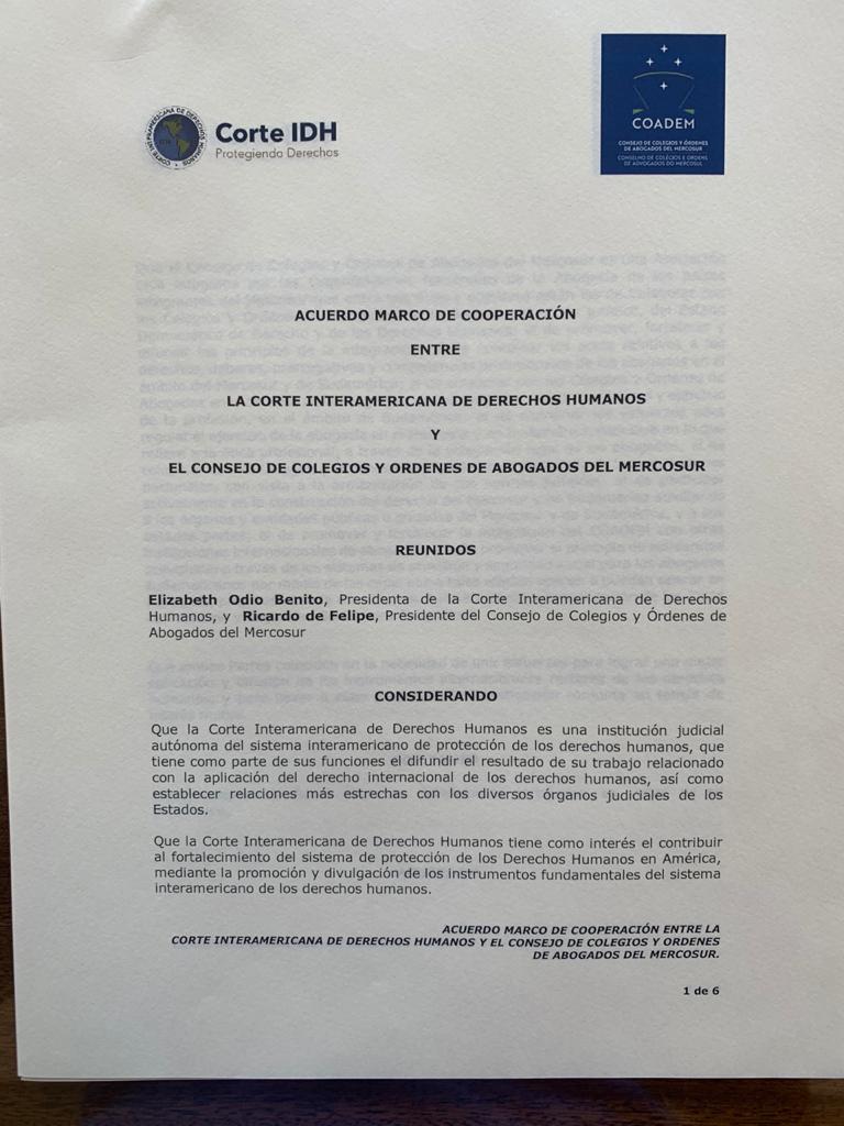 Con fecha 10 de diciembre de 2020 se firmó entre la CIDH y el COADEM un acuerdo marco de cooperación por el cual ambas Instituciones se comprometen a coordinar esfuerzos para fortalecer sus relaciones, profundizar el conocimiento del derecho y difundir los instrumentos internacionales para la promoción y defensa de los derechos humanos a través de la realización de congresos, seminarios, practica de Abogados ante la CIDH, asistencia jurídica gratuita para personas que no tengan recursos para acceder al sistema interamericano y demás actividades que contribuyan al acceso y difusión del sistema interamericano de derechos humanos