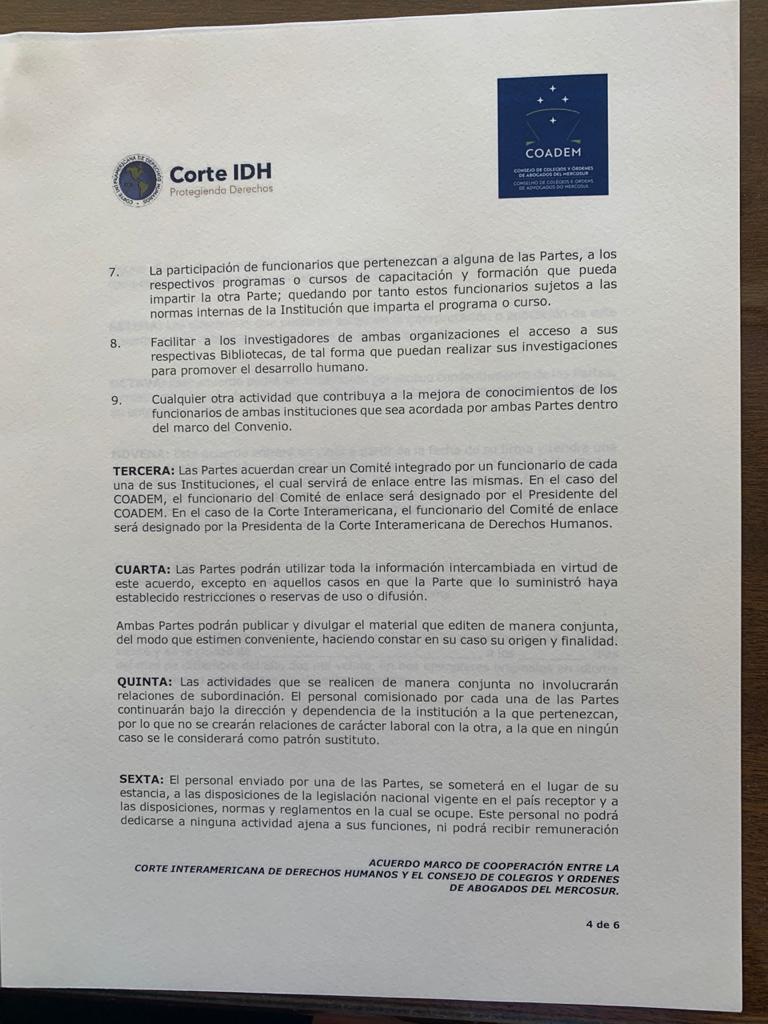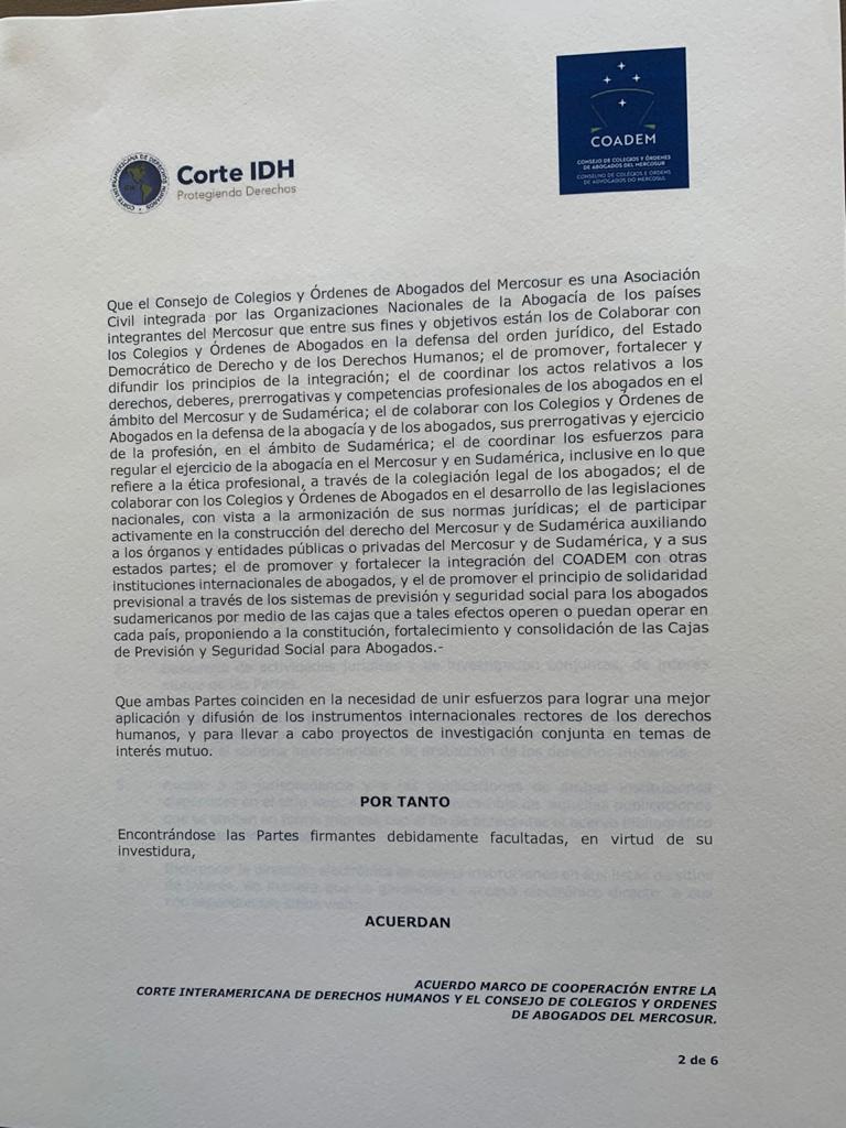 Con fecha 10 de diciembre de 2020 se firmó entre la CIDH y el COADEM un acuerdo marco de cooperación por el cual ambas Instituciones se comprometen a coordinar esfuerzos para fortalecer sus relaciones, profundizar el conocimiento del derecho y difundir los instrumentos internacionales para la promoción y defensa de los derechos humanos a través de la realización de congresos, seminarios, practica de Abogados ante la CIDH, asistencia jurídica gratuita para personas que no tengan recursos para acceder al sistema interamericano y demás actividades que contribuyan al acceso y difusión del sistema interamericano de derechos humanos
